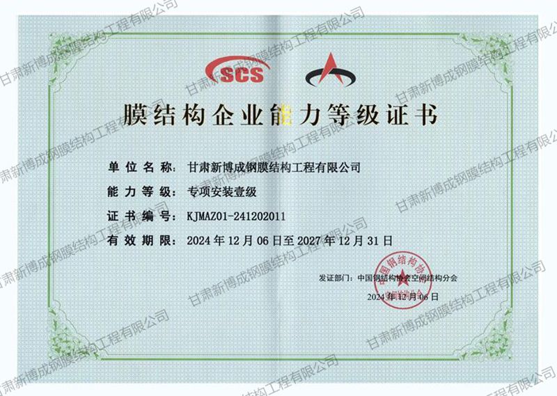 膜结构企业能力等级证书 专项安装一级